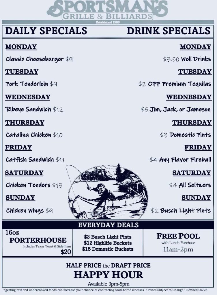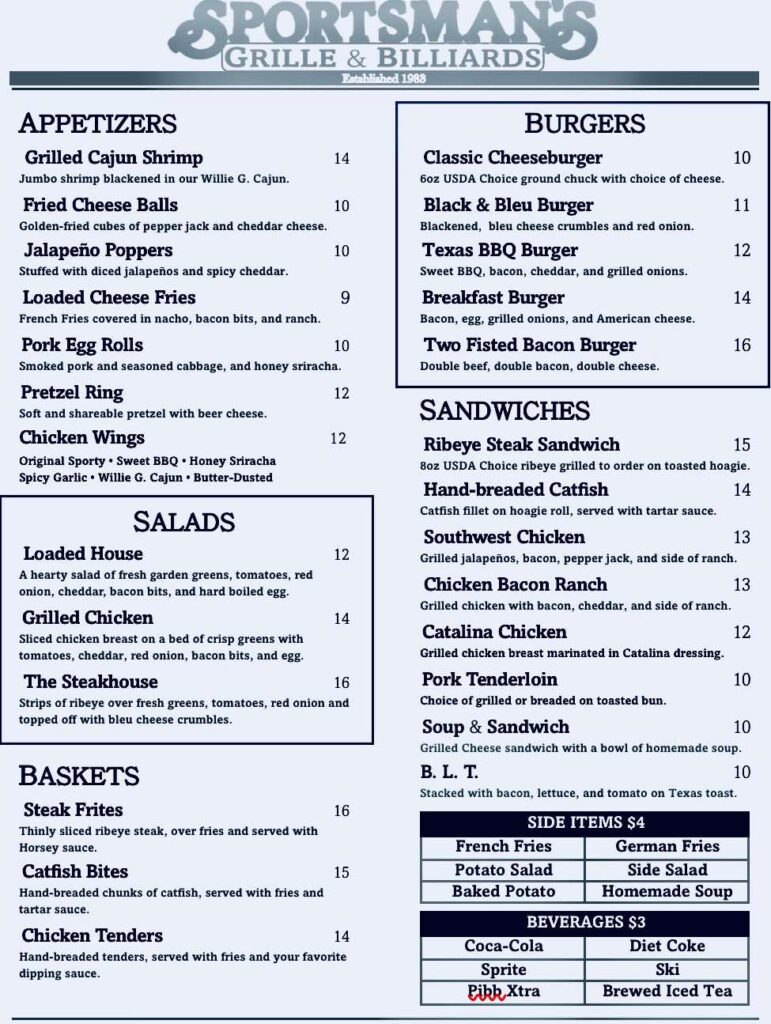 Sportsman's is the area's top college bar spot for fun, great drinks, patio hangs and pool but that doesn’t mean we fall short on our food. We pride ourselves in our delicious made-from-scratch food served up hot for lunch, dinner and late nights every day. Always fresh, never frozen, our extensive grub menu has something to please even the most discriminating palate. If you're looking for Evansville's best burger, cheese balls or tenderloin, Sportsman's Grille and Billiards is a must try!
